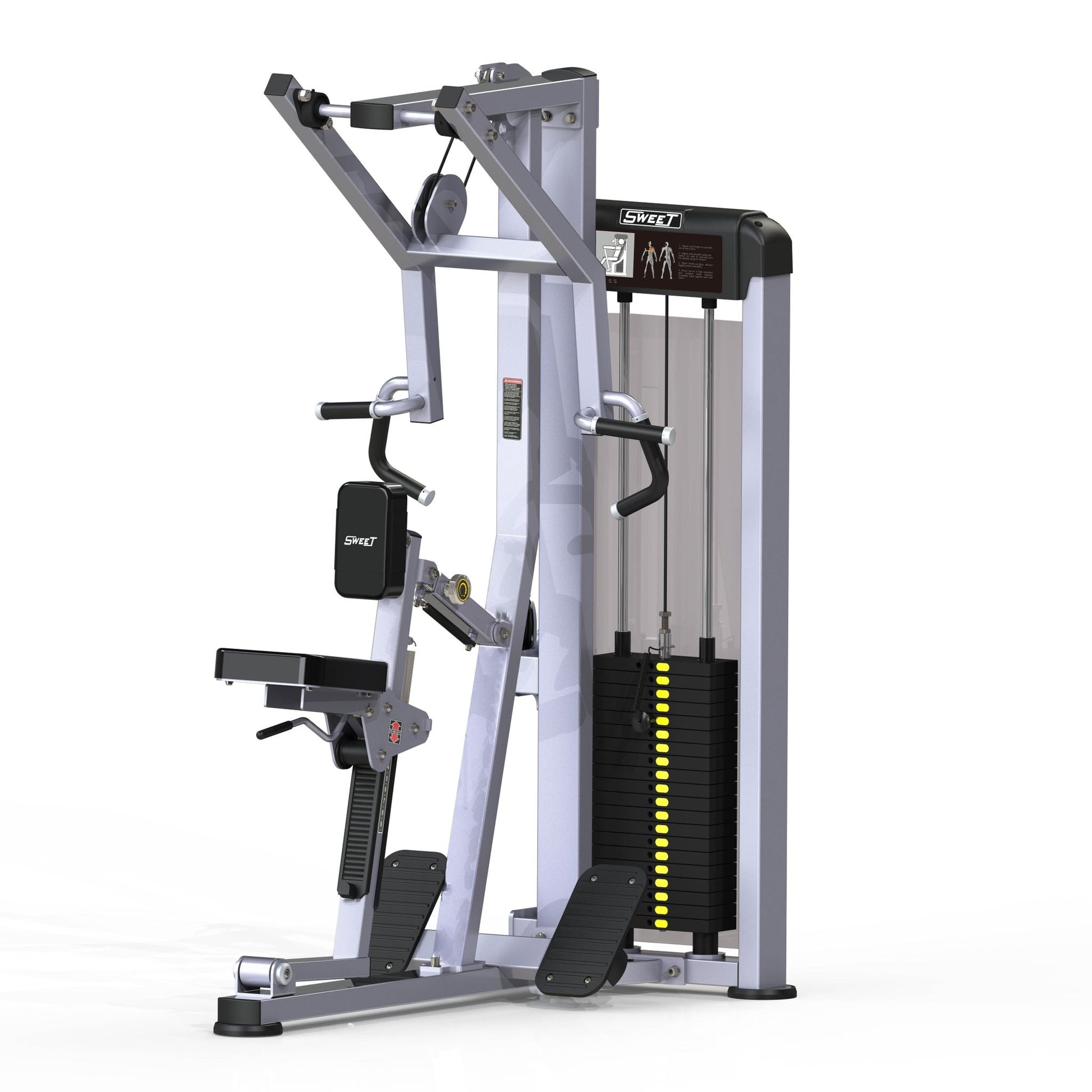 Introducing the Sweet Selectorized Seated Row, the ultimate machine designed to enhance your back strength and improve your overall upper body fitness. With its stylish silver finish, this robust piece of equipment not only looks great but also provides a highly effective workout experience.