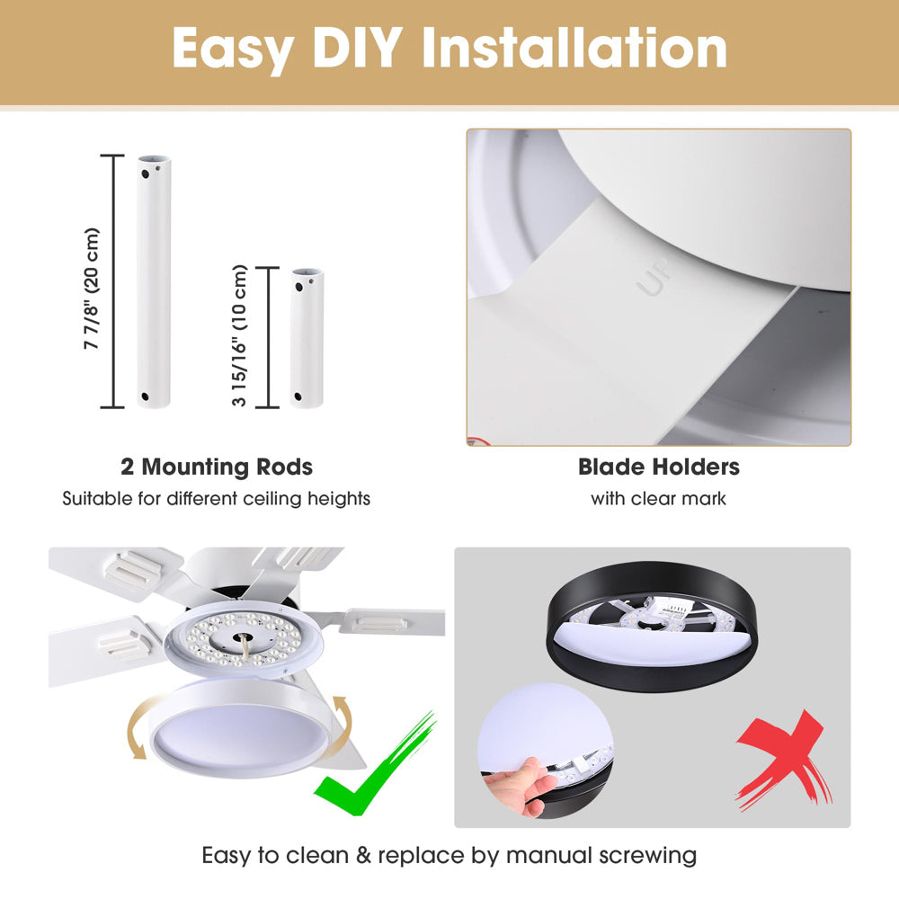 52 inch ceiling fan with LED light and 5 double-sided blades offers powerful air circulation with 6-speed settings and allows for stepless dimming and color temperature adjustment through remote control. It creates a comfortable ambiance for front porches, living rooms, bedrooms, dining rooms, kitchens, and other spaces.