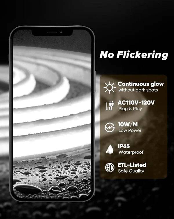 - Flicker Free: The COB LED neon strip light is designed to be flicker-free, with no visible flicker to the naked eye. Additionally, video recordings taken from a distance of 1 meter or more will also appear flicker-free.