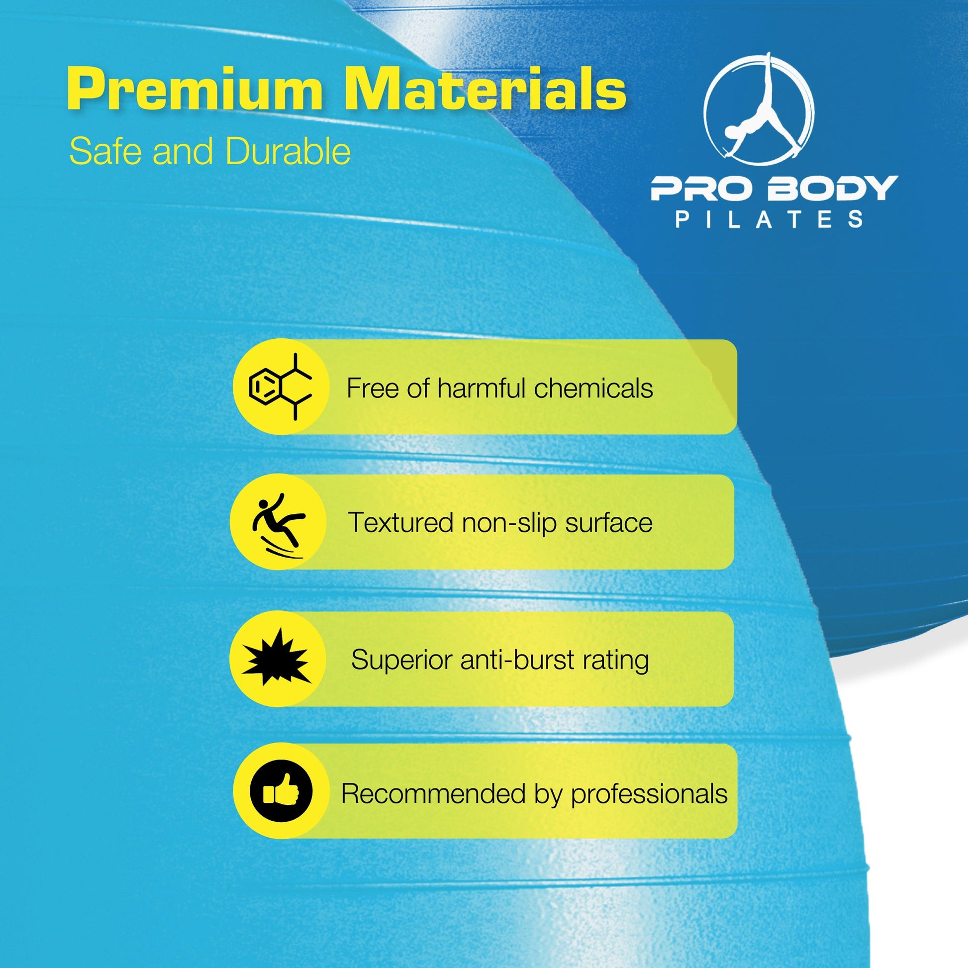 ANTI BURST AND SLIP RESISTANT - Pilates ball with heavy duty thick PVC design able to withstand the most punishing workouts and training, yoga or Pilates programs. Tough Non rubber PVC swiss ball that is considered antiburst up to 2000 lbs.